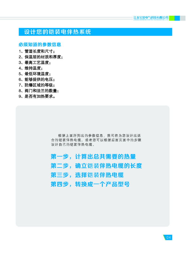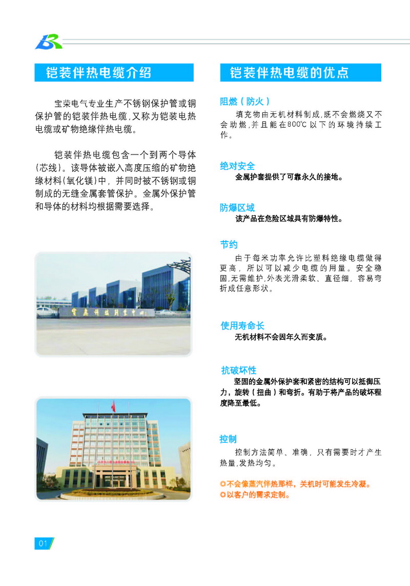 寶榮電氣專業(yè)生產(chǎn)不銹鋼保護(hù)管或銅 保護(hù)管的鎧裝伴熱電纜,又稱為鎧裝電熱 電纜或礦物絕緣伴熱電纜。 鎧裝伴熱電纜包含一個(gè)到兩個(gè)導(dǎo)體 (芯線)。該導(dǎo)體被嵌入高度壓縮的礦物絕 緣材料(氧化鎂)中,并同時(shí)被不銹鋼或銅 制成的無(wú)縫金屬套管保護(hù)。金屬外保護(hù)管 和導(dǎo)體的材料均根據(jù)需要選擇。